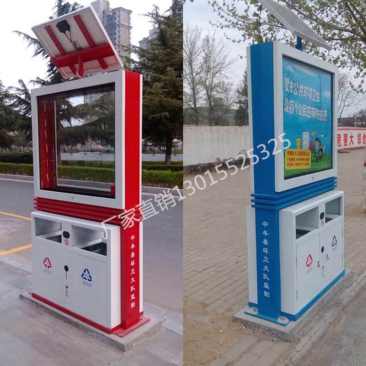 廣告果皮箱部分材料: 國標熱鍍鋅板1.2mm 鋼化玻璃5mm、6mm(常規為5mm) 燈箱外表處理180度高溫靜電噴塑